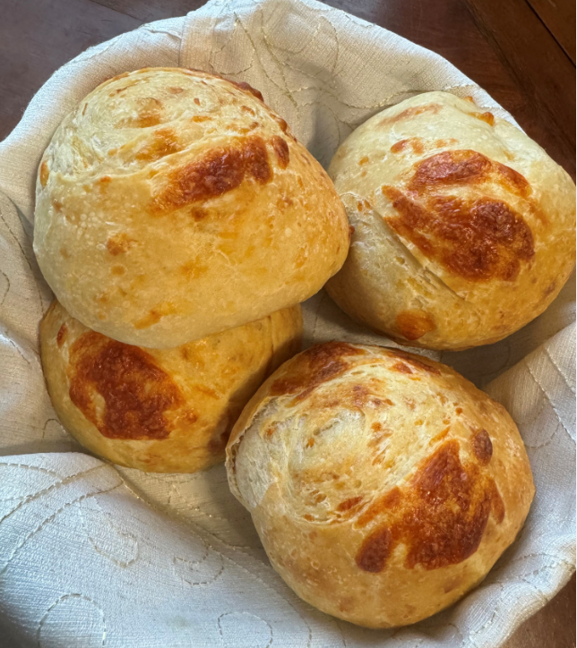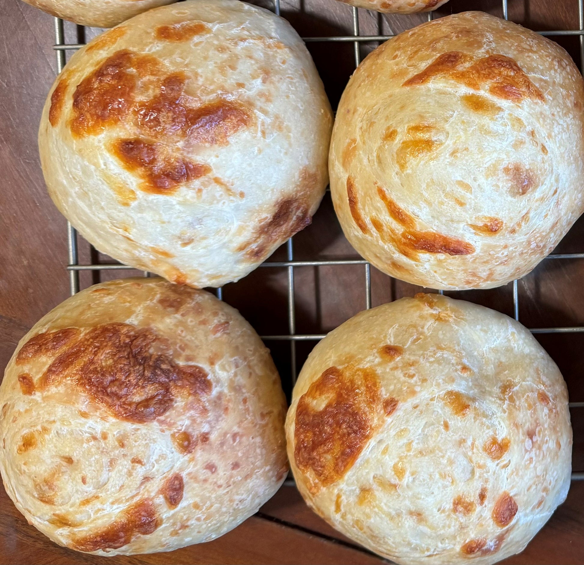 Set of 4 freshly baked oversized dinner rolls made with a 4-Cheese blend of Parmesan, Asiago, Cheddar, and Mozzarella. Homemade by "Heavenly Sourdough, by Ashley" Cottage Bakery style, with no additives or preservatives. Only minimal ingredients - bread flour, water, salt, and cheese. One of our most popular offerings! Dropped off on Saturday morning pick up only