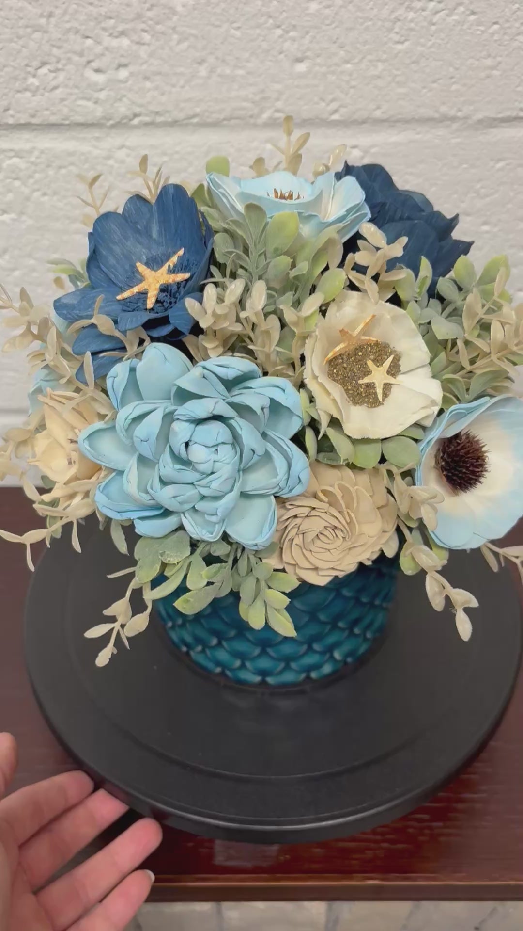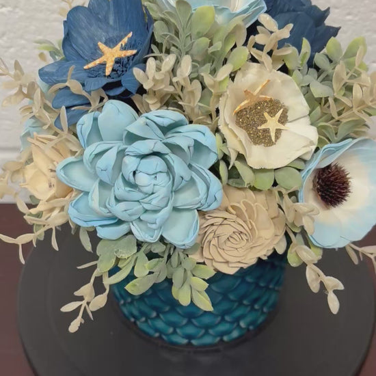 Beach themed sola wood flower arrangement in a glass container with starfish accents