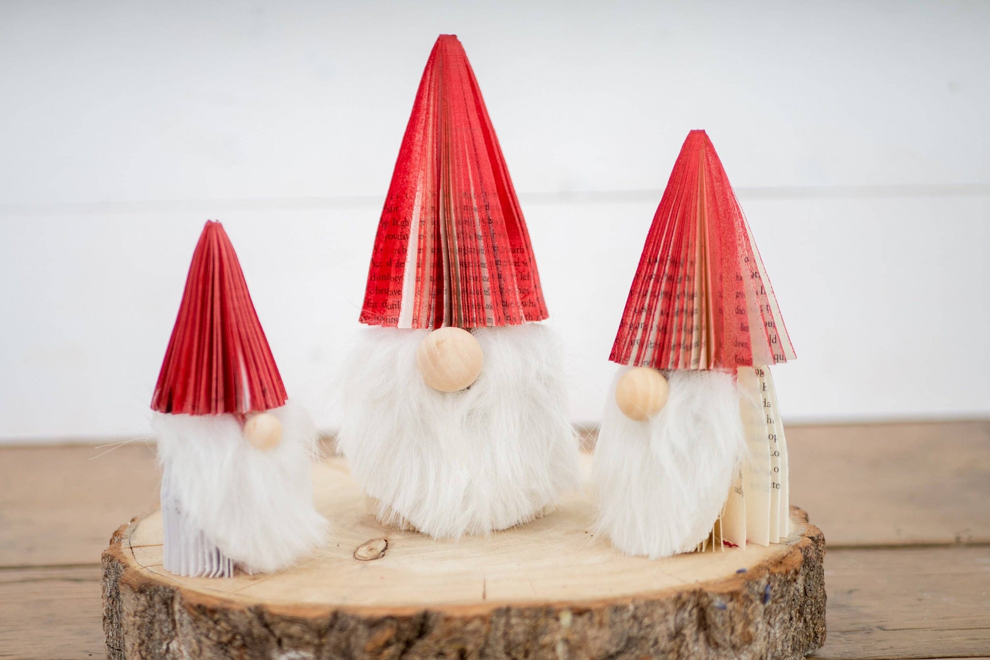 These Christmas gnomes are made from a used book and feature a vibrant red color. They will definitely serve as a conversation starter and make a great addition to the holiday decor enthusiast.