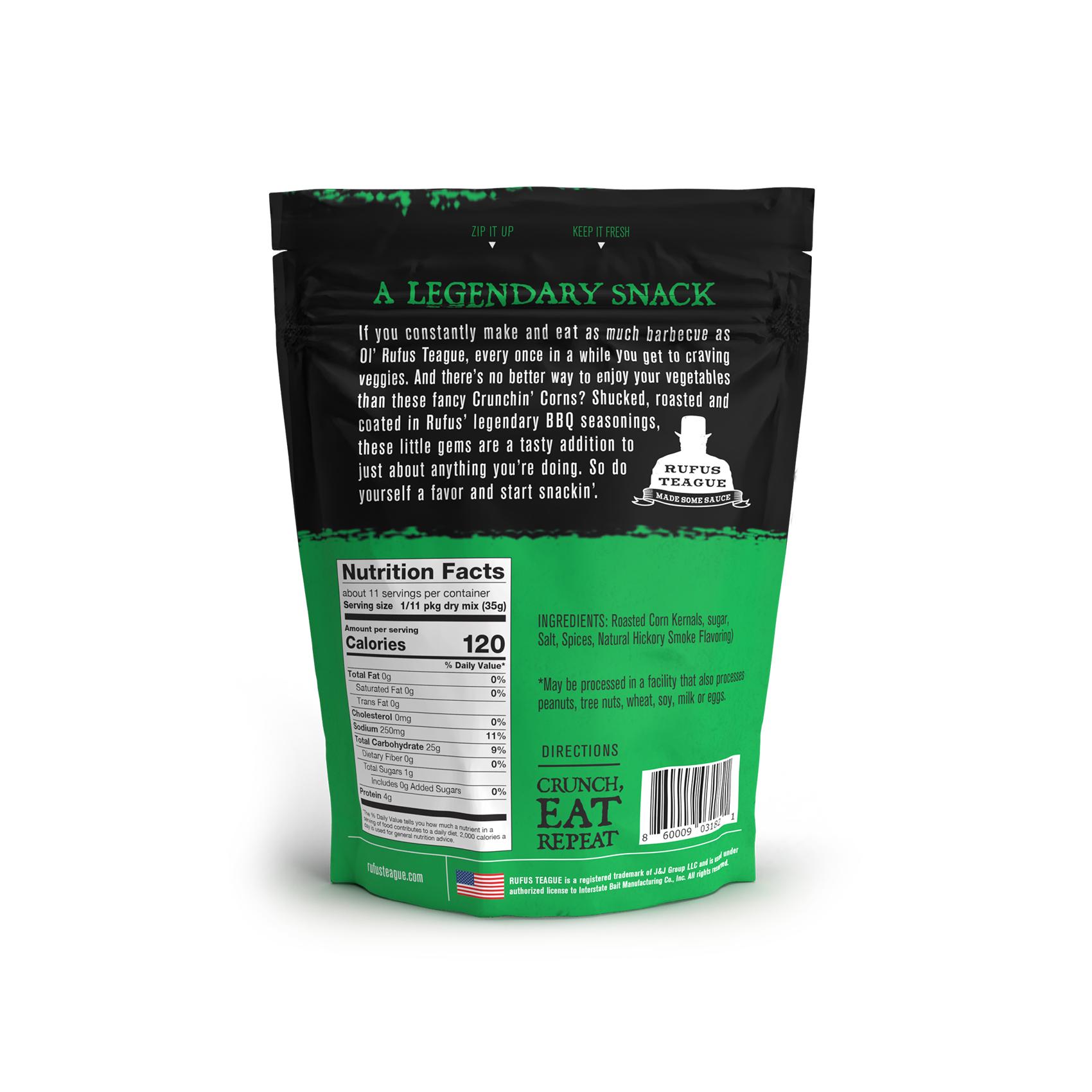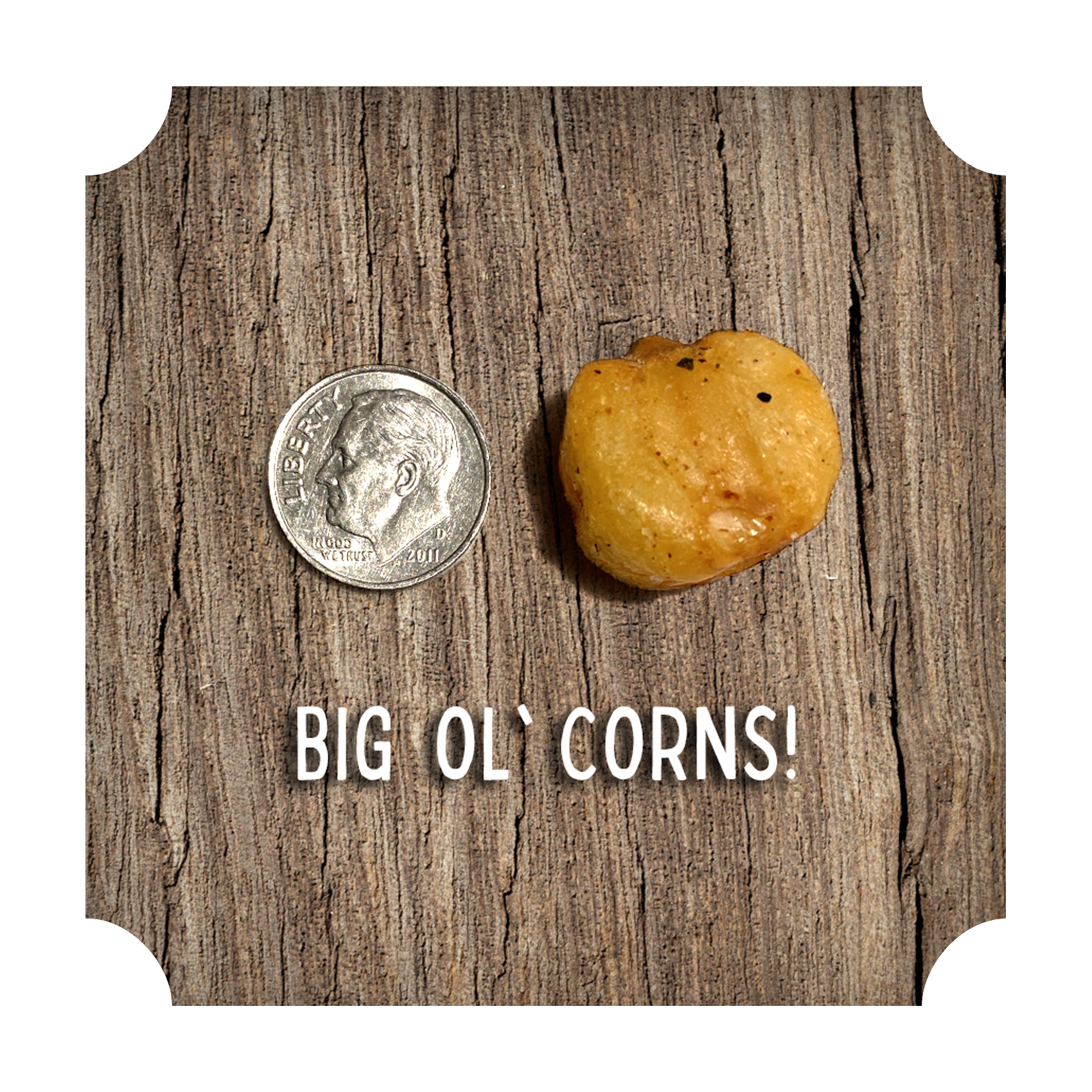 Our Crunchin' Corns are extra-huge, roasted corn kernals with big time deliciousness. Seasoned up with flavors only Rufus knows how to concoct. The combination of smoky BBQ with a hint of sweetness mix perfectly with the creamy spiced goodness of Ranch to make a snack that will leave you wanting more. And more. And more. And more. And... more.