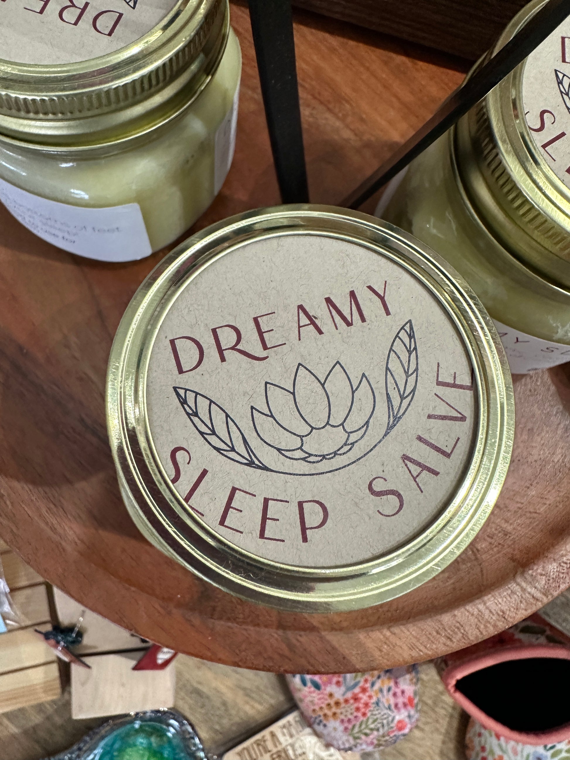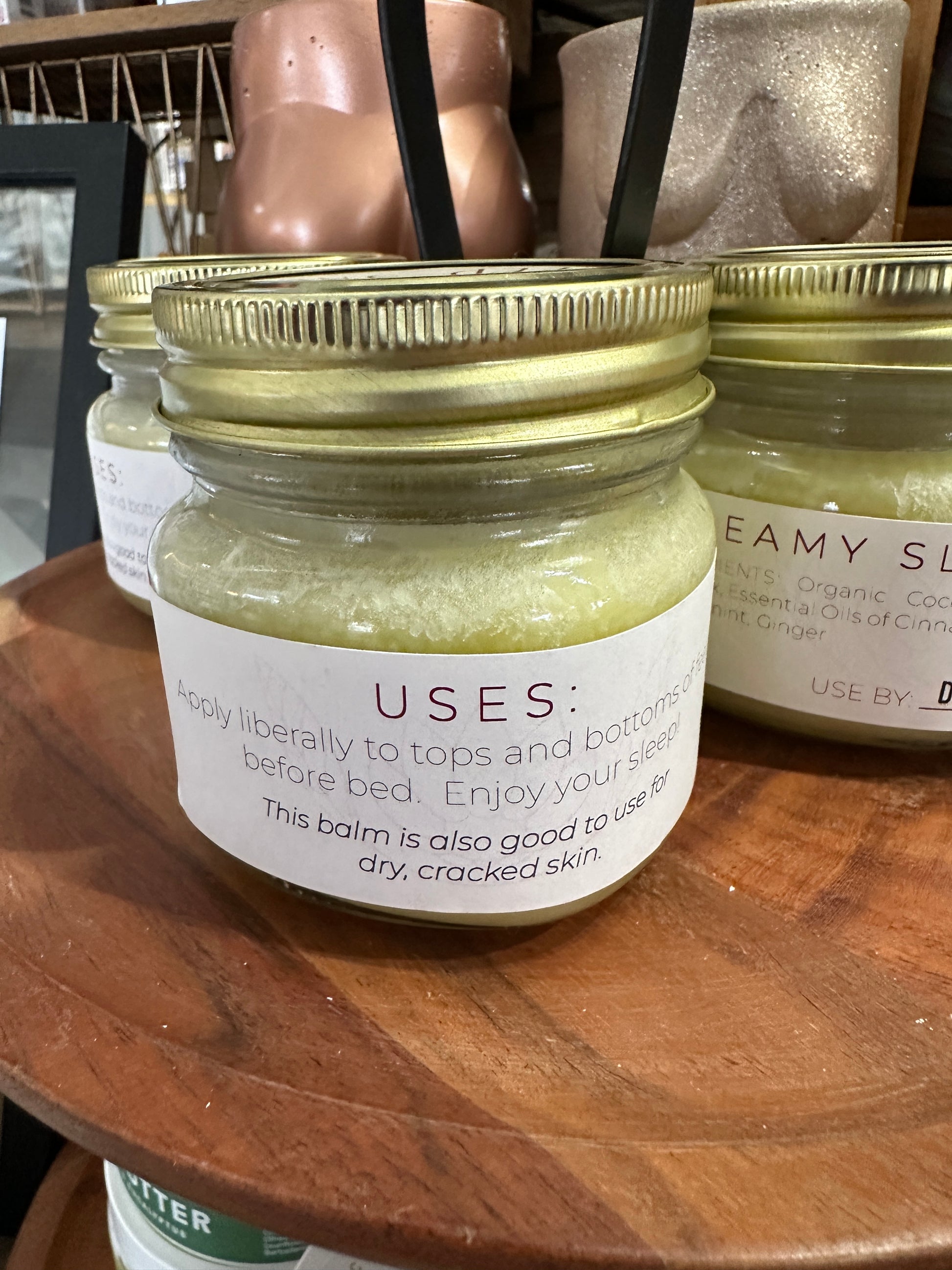 A dreamy salve to help relax you. Apply liberally to toes and bottoms of feet before bed, also great for cracked skin. Made with Organic coconut oil, Organic Olive Oil, Beeswax, Essential Oils of cinnamon bark, grapefruit, Lemon, Peppermint and Ginger