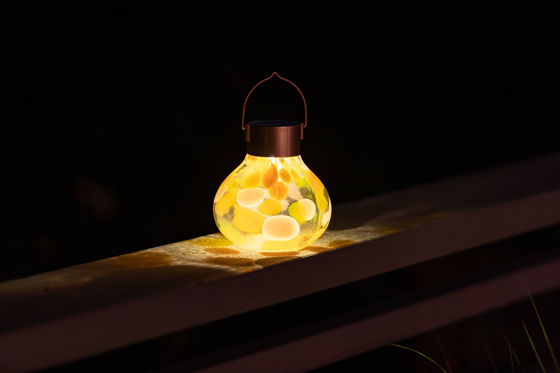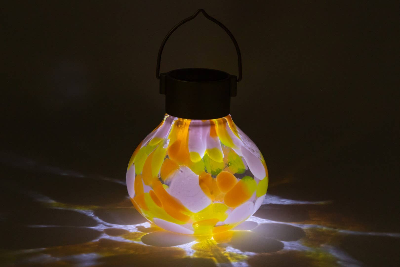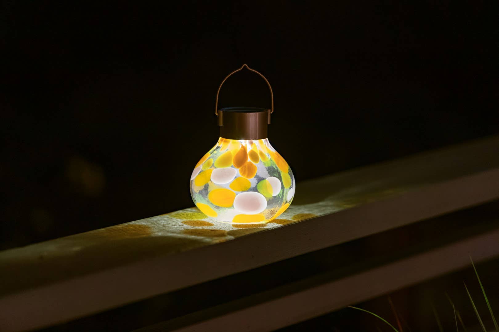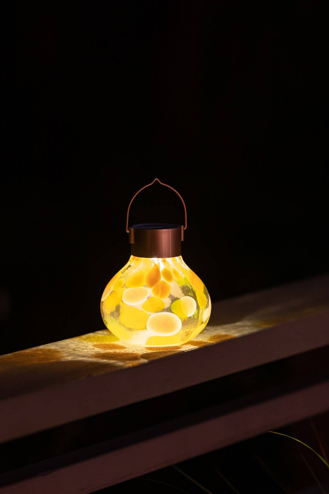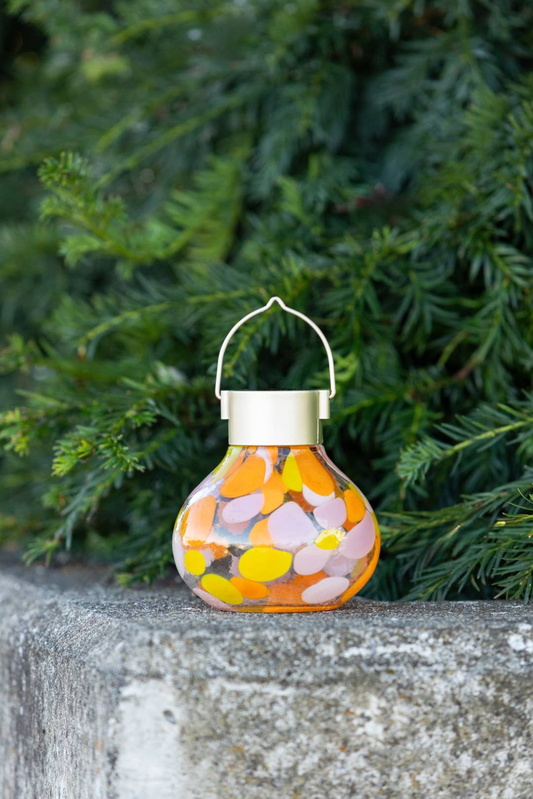 Catching the sun’s rays, our Solar Tea Lanterns light up by night to cast a warm romantic glow from within. Clean and quaint, each hand-blown glass lantern is a unique work of art. With large dotted glass patterning in bold yellows, pinks and whites you will feel the glow of the tropics when it lights itself up by night.