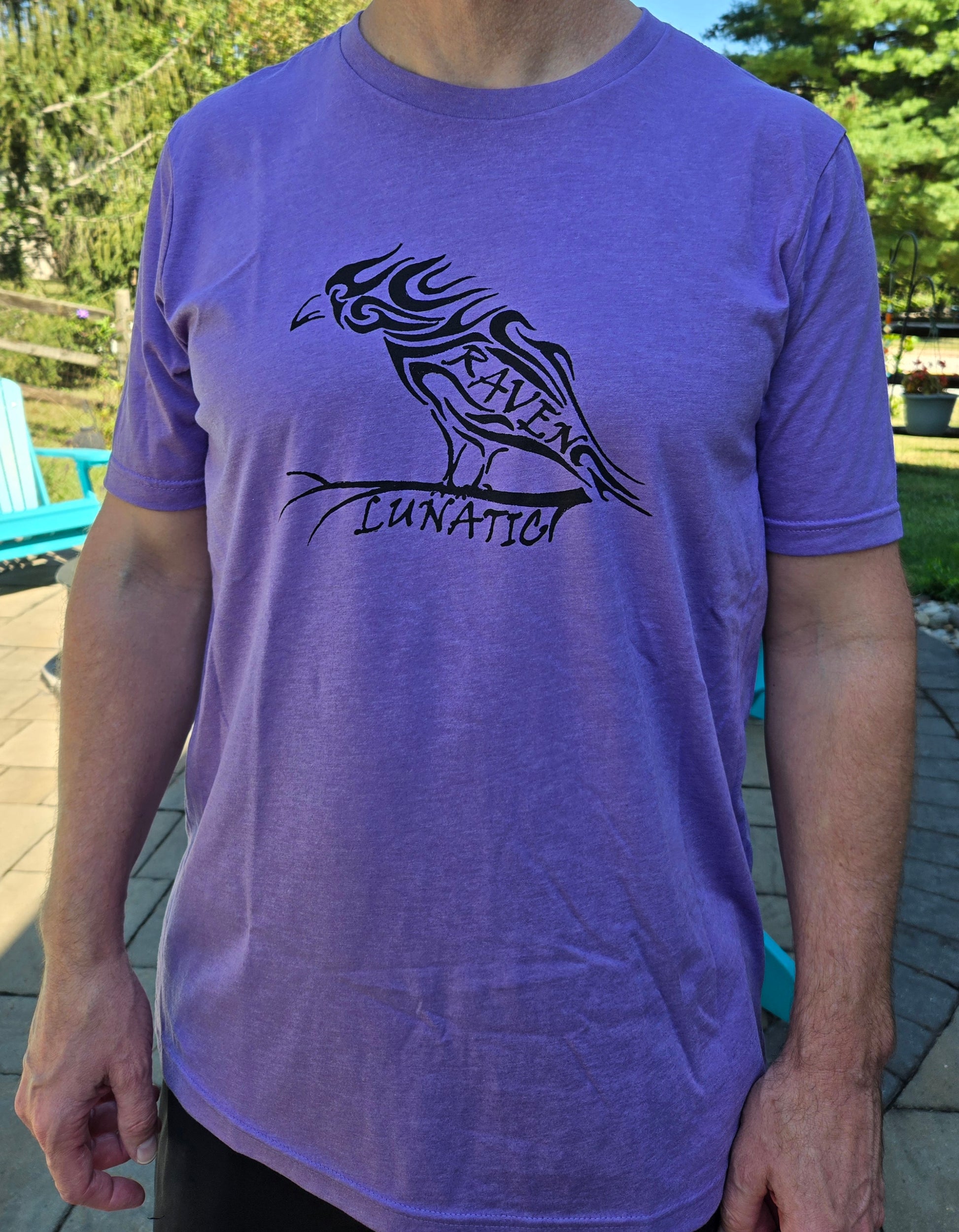 Original Raven Lunatic design screen printed by hand is featured on a soft purple blended short sleeve unisex tee by Bella+Canvas.
