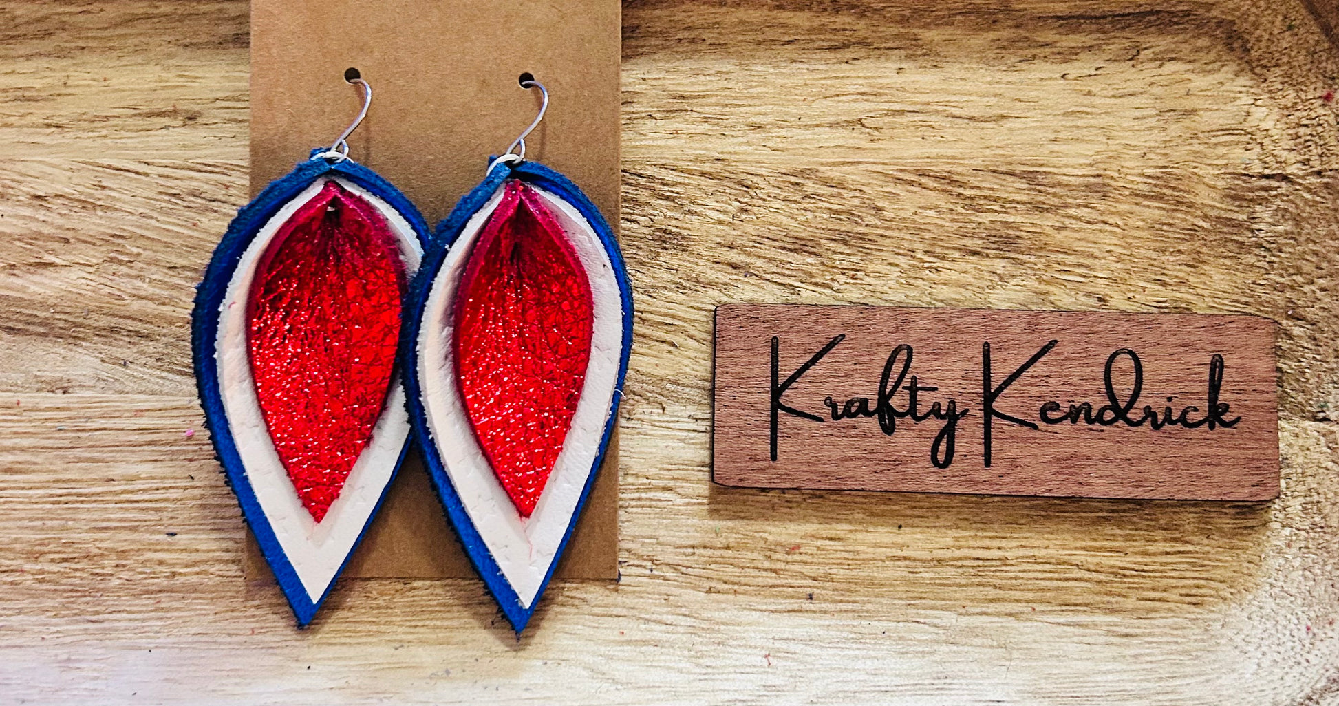 Red, White with embossed stars and metallic blue pinched petal earrings