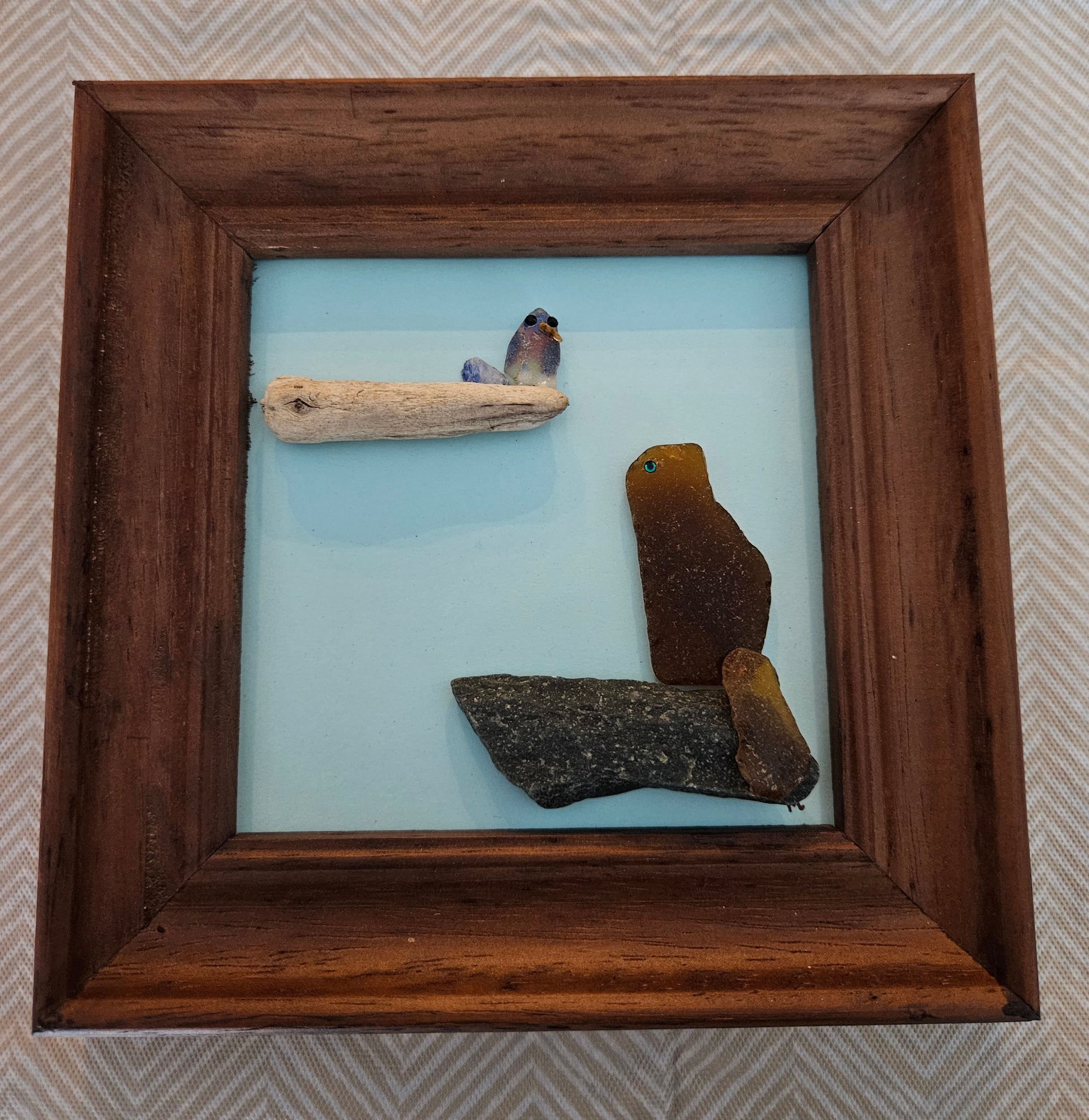 Sea glass brown cat looking up at sea glass bluebird on branch. 6" x 6" brown frame.