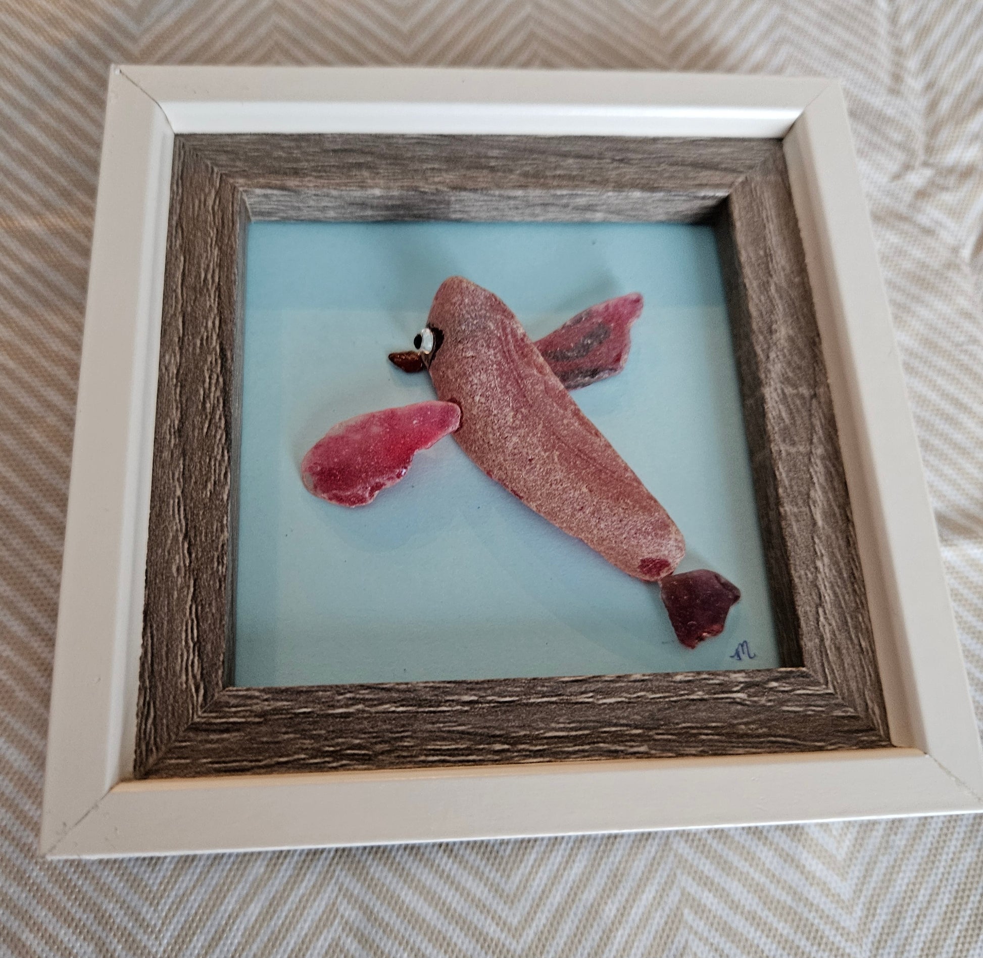 Flying sea glass Cardinal in 4" x 4" white-and-driftwood frame.