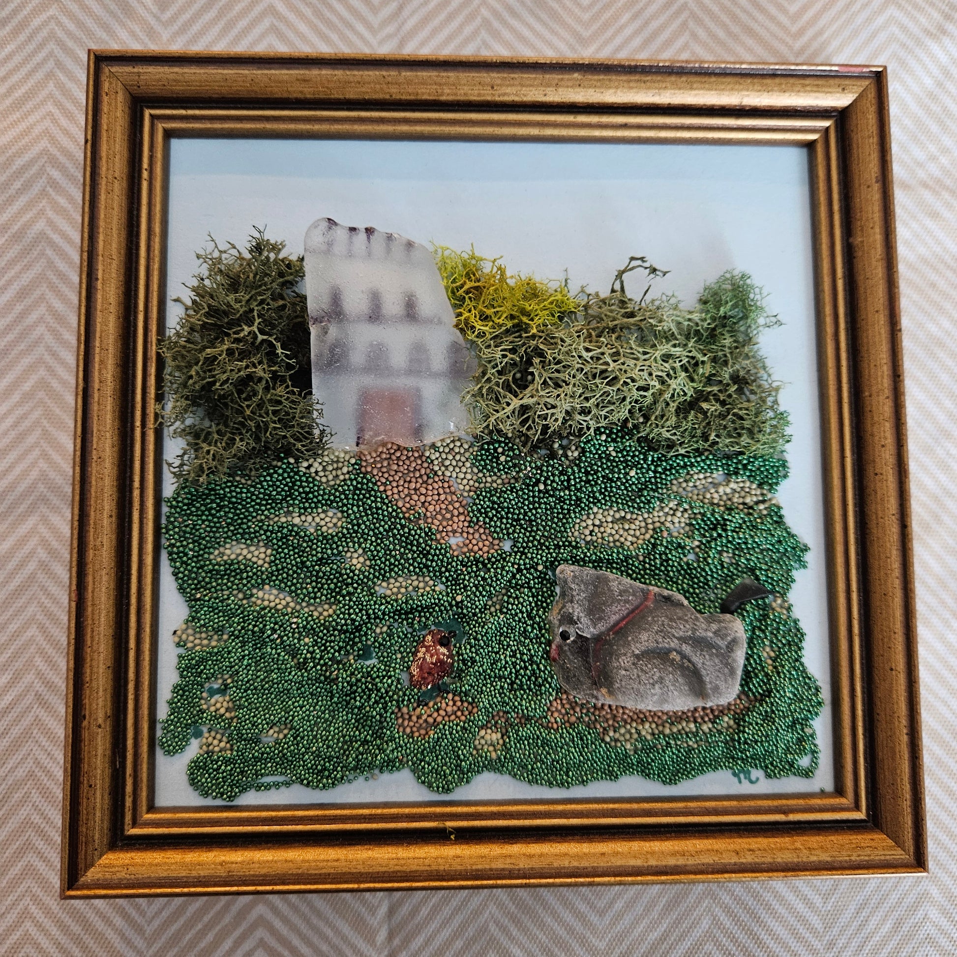 Sea glass castle in background with unusual one piece of sea glass resembling a Scottie dog, along with a red bird. 5" x 5" gold frame.