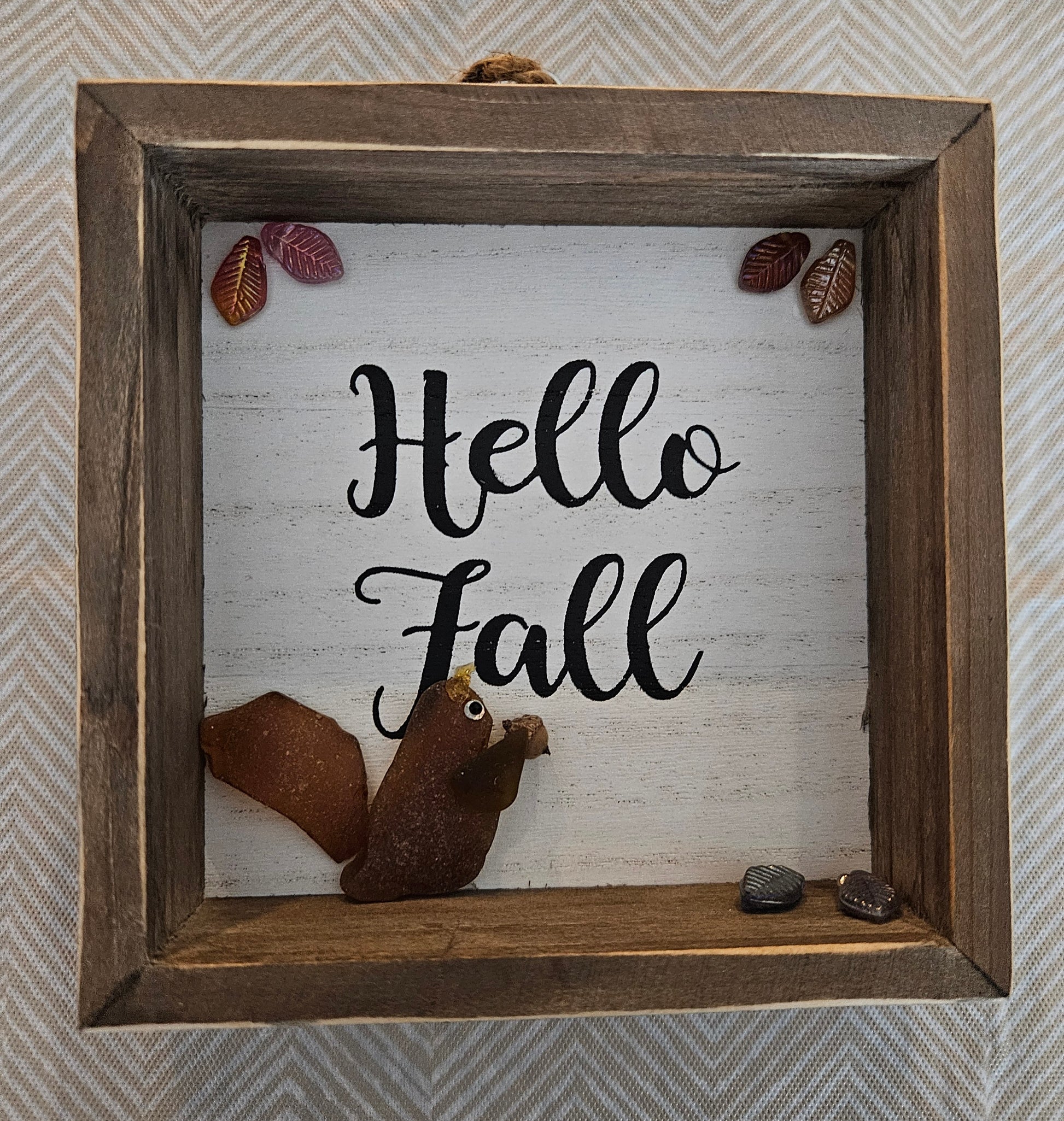 Sea glass squirrel in shadowbox with glass leaves and "Hello Fall" in background. Rope hanger.