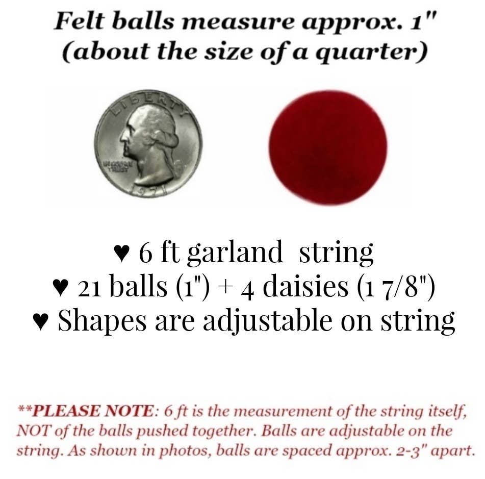 ♥ Felt balls measure 1". Daisies measure 1 7/8"